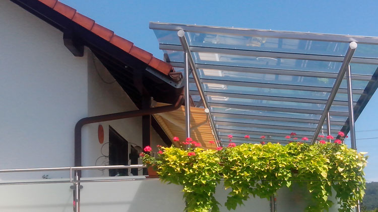 Unsere angebotenen Überdachungen bestehen aus pulverbeschichtetem Aluminium. Sie können Polycarbonatplatten oder Verbundsicherheitsglas (VSG) für Ihre Überdachung wählen.